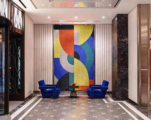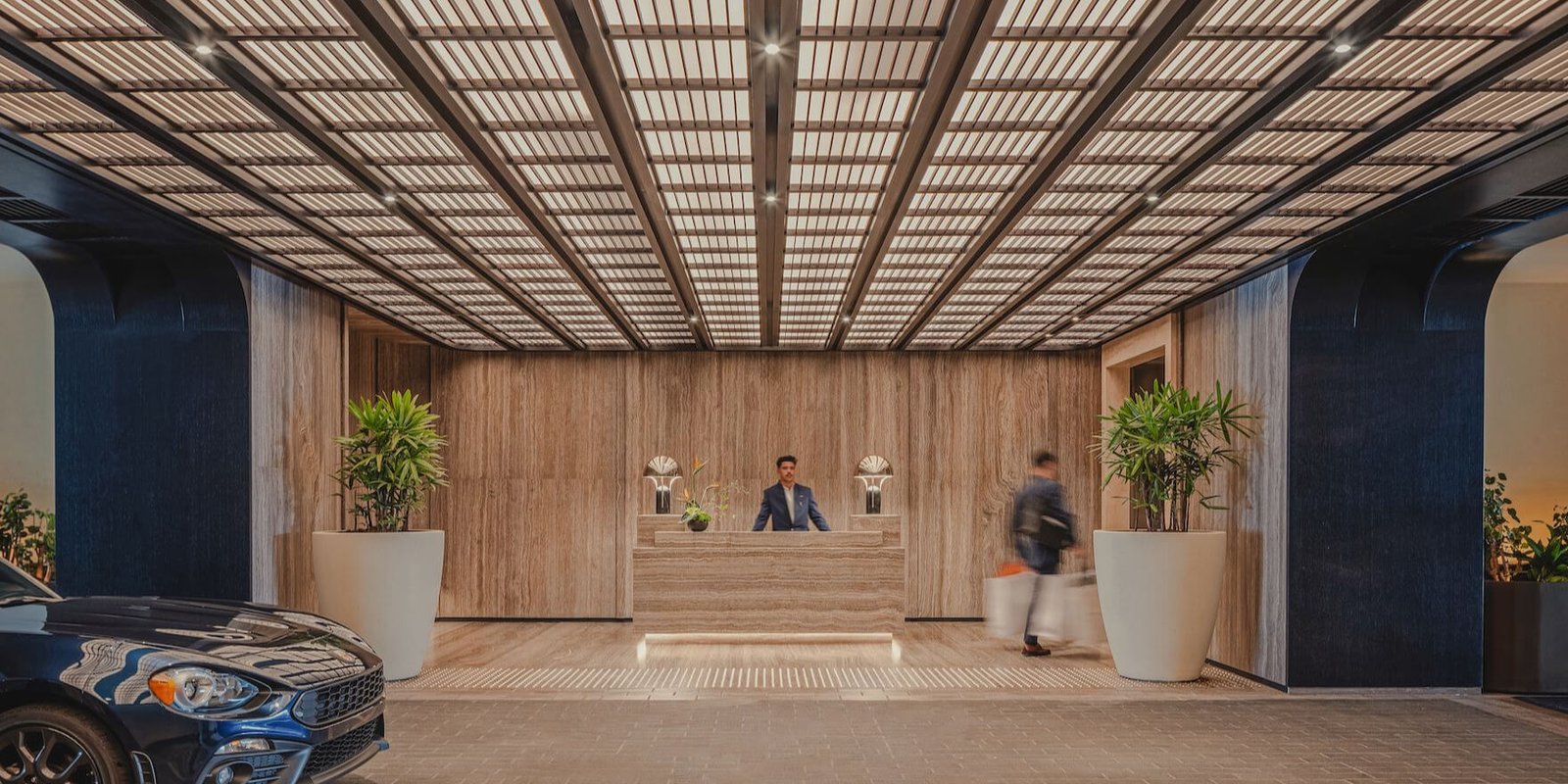 The lobby is an interplay of bold, natural materials